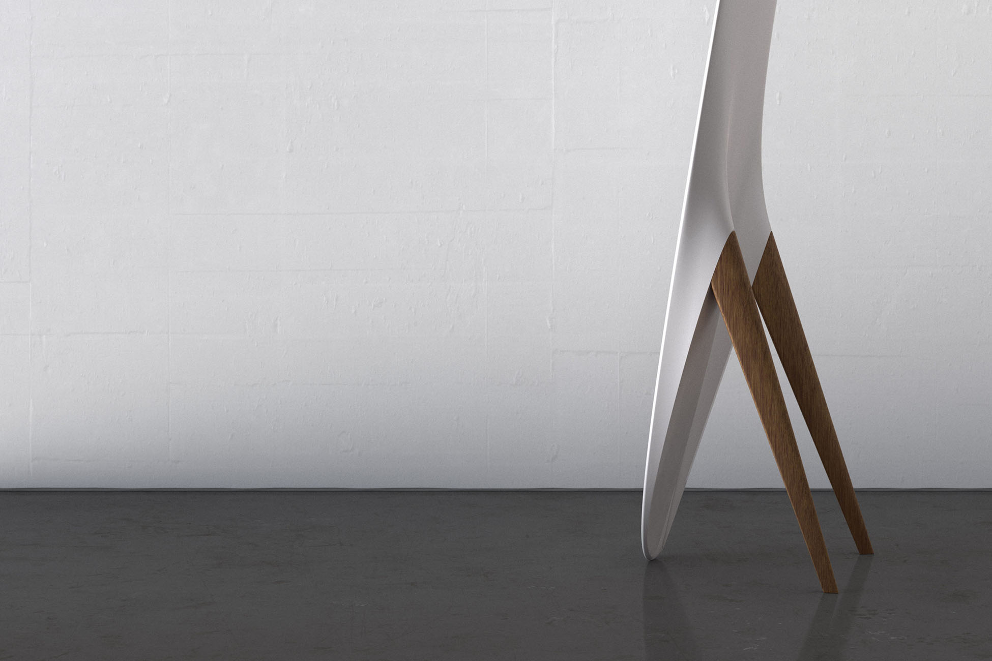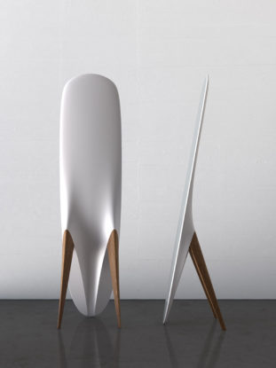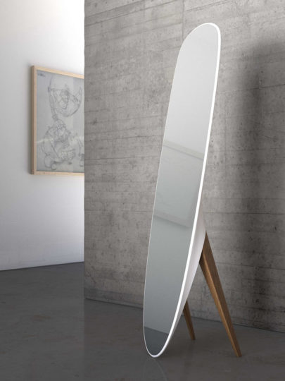 Adore Adore Aufgeschnitten und poliert wie ein Bergkristall präsentiert der Spiegel seine wahre Kostbarkeit: Ihr Spiegelbild! In einer freien Aussenkontur fokussiert er Ihre Silhouette. Elegant steht der Spiegel auf nur einem Punkt seines Rahmens und wird rückseitig von zwei schlanken Standbeinen aus Eiche gestützt. Der Mineralwerkstoff ermöglicht die organisch geschwungene Schale, die das Spiegelglas umfasst und den Formverlauf der Standbeine aufgreift. Das Design verleiht dem Spiegel eine skulpturale Qualität. Ein freistehender Spiegel, der seine Rückseite nicht verbergen braucht und auch in der Raummitte einen würdevollen Platz findet.