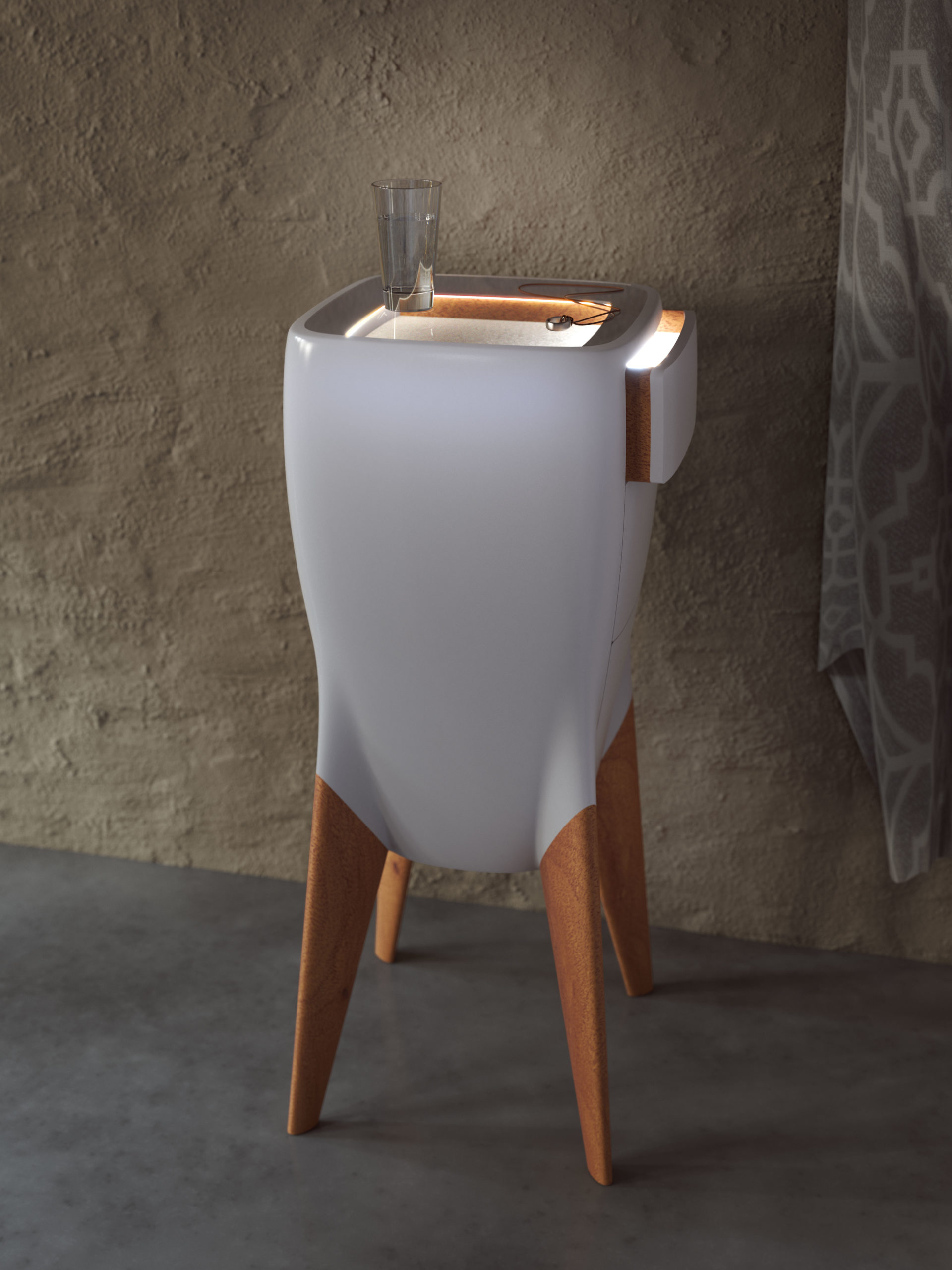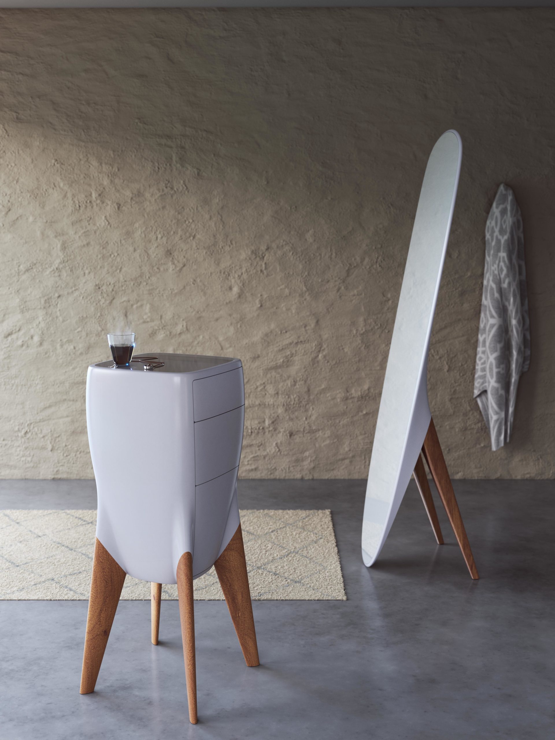 Revere Revere Vier Beine aus Eiche erheben einen Korpus, geformt aus einem Mineralwerkstoff. Sinnliche Schwünge, aufstrebende Konturen. Breit und hoch aufgestellt ist ein nahes Herantreten von allen Seiten möglich. Stufenlos betten sich Schubladen in die Oberfläche ein. Wie eine Glas-Vitrine offenbart ein Sichtfenster ausgewählte Kostbarkeiten. Mehr wie ein Schrein, als wie ein Schrank wirkt diese Schmuck-Kommode mit ihrem einzigartigen Design.